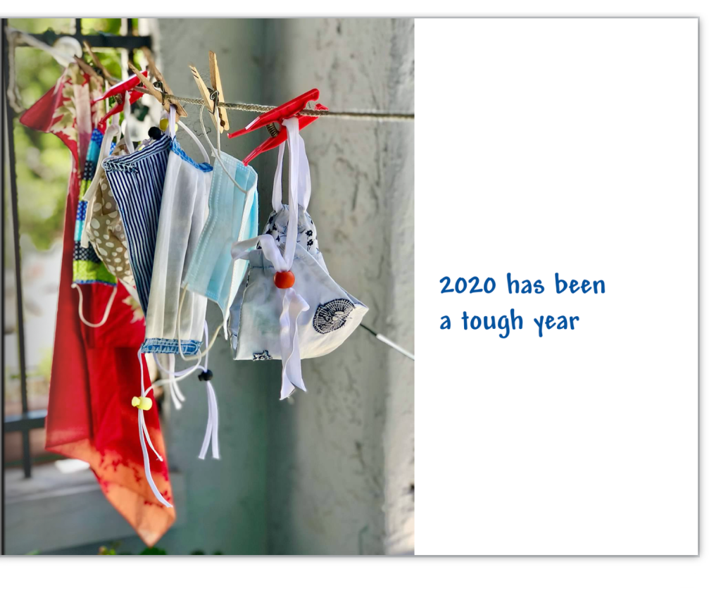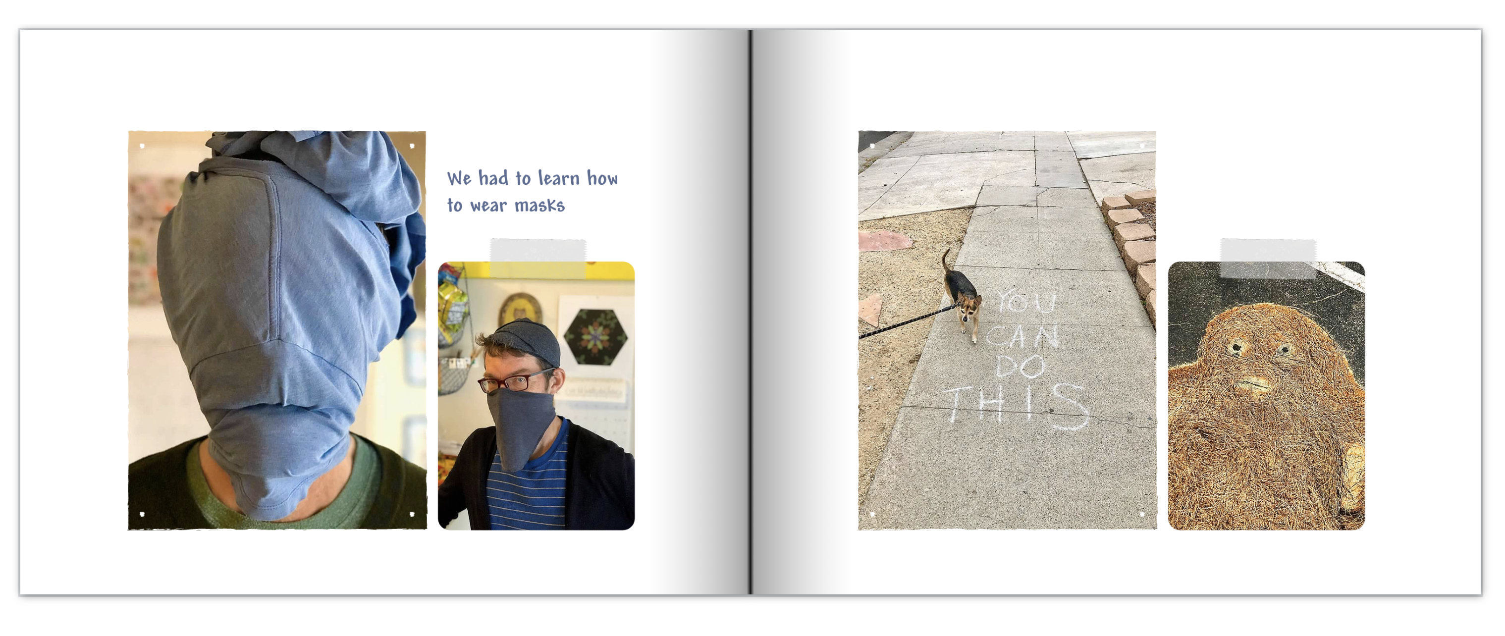I quickly gathered up the mish mash of 2020 and imported to Shutterfly. They do their best to “help” get your book going and immediately I had some spreads to look at. They put the absolute worst photo on the cover. It’s an iPhone selfie of us three all masked up. You can’t see any facial features except eyes and I’m thwarting that with dark sunglasses. Everyone looks awkward and unhappy. This was my Aha! moment. Lean into the awful! Make the obstacle the solution! This stupid photo album would showcase our stupid year. I’ll keep the masks on the cover!