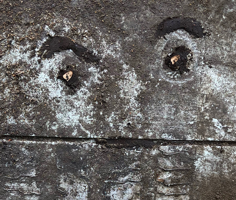 The dogs and I walk by a demolition site and see a weathered board covered by a muddy tire tread. I need to make a face on this!